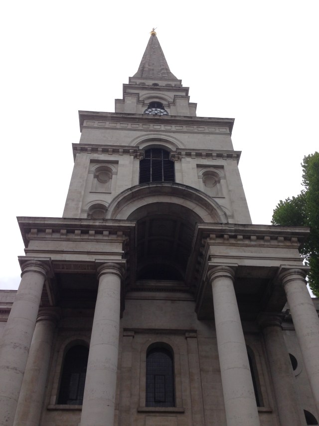 This is one of Hawksmoor’s finest churches, built 1714-29 but its construction was plagued by lack of funds. It towered over the poor area of Spitalfields, with many small cottages built for the Huguenot who had fled persecution in France. It was instigated by an Act of Parliament of 1710 which established a Commission to build 50 churches in London and Westminster. It was funded by a duty on coal entering the city of London which was originally levied to fund the rebuilding of St Paul’s and other city churches destroyed by the Great Fire.