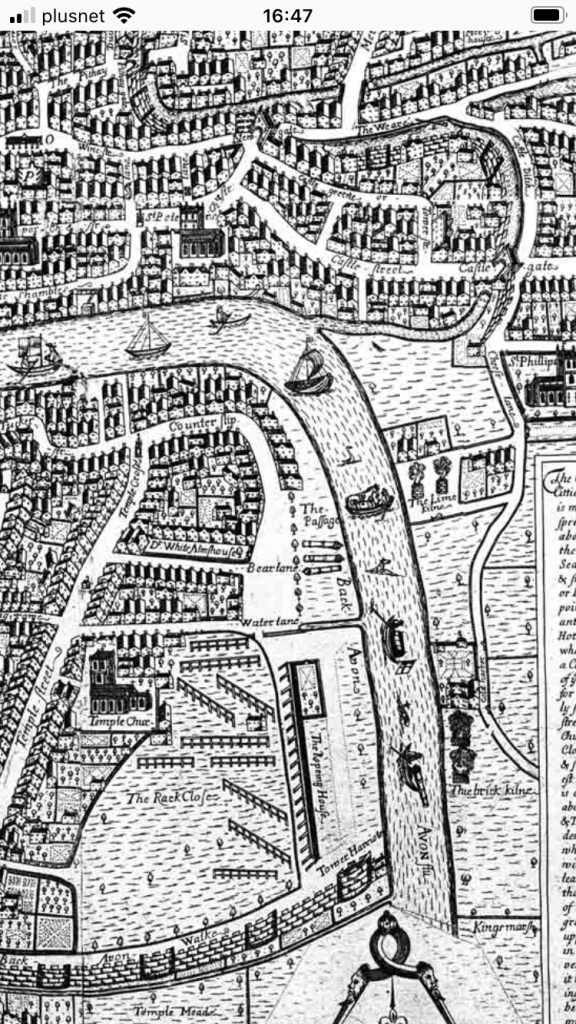 This is one of my favourite discoveries from the first proper map of the city of Bristol by draper Jacob Millers dated 1673. It’s full of fascinating details of buildings and streets. But look closely: