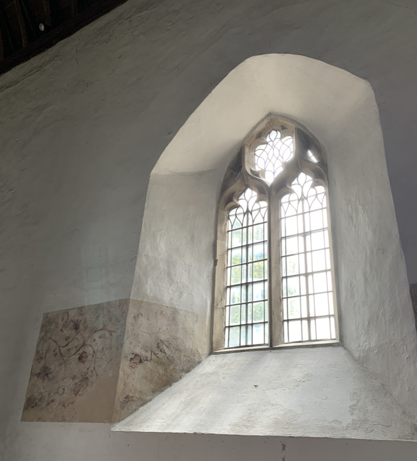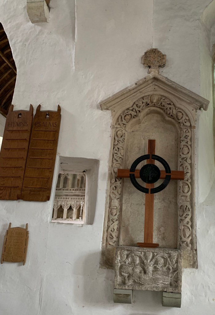 Carved Jesse tree with squint to allow priest to follow main mass at high alter. Often believed to have been leper window.