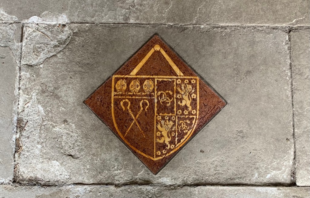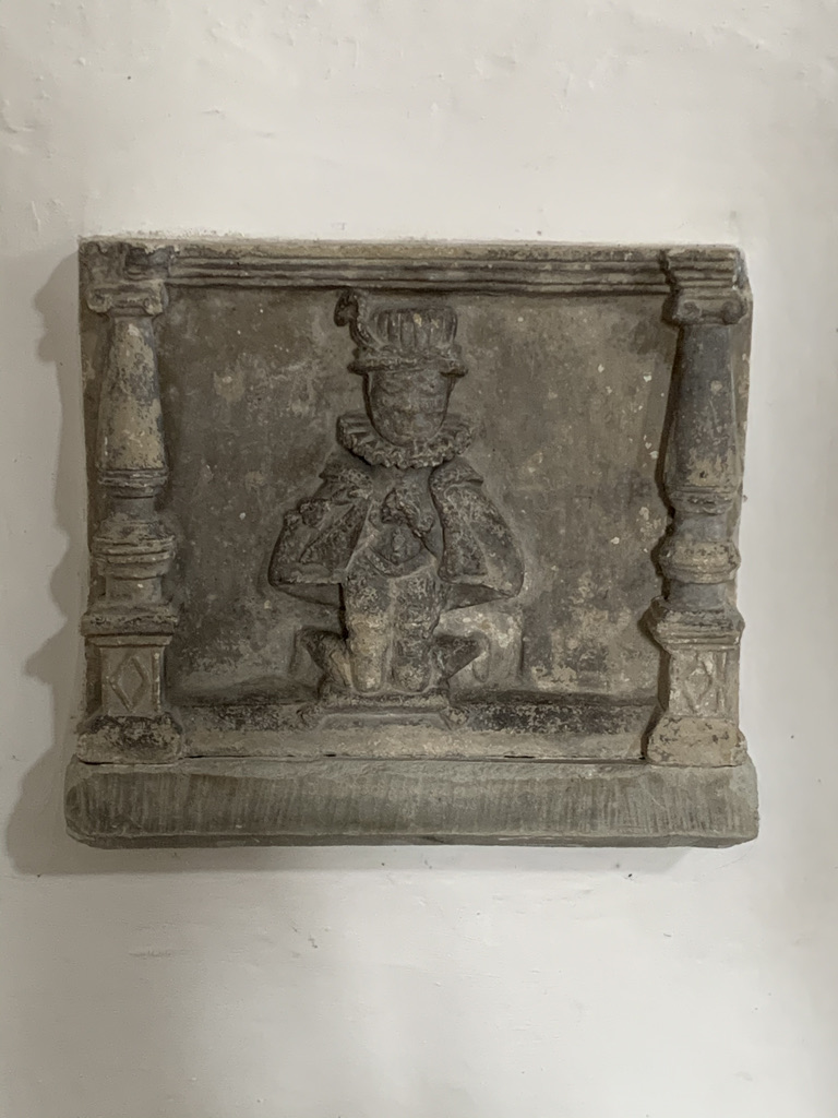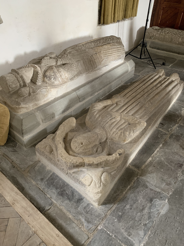 Effigy with only head visible is he oldest. Tonsure, so a priest, 13th century. Translation of base: Let not the stone be trodden on; let her who lies be protected. Was this a time of raids?