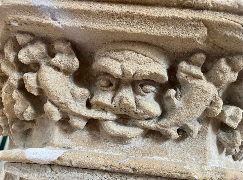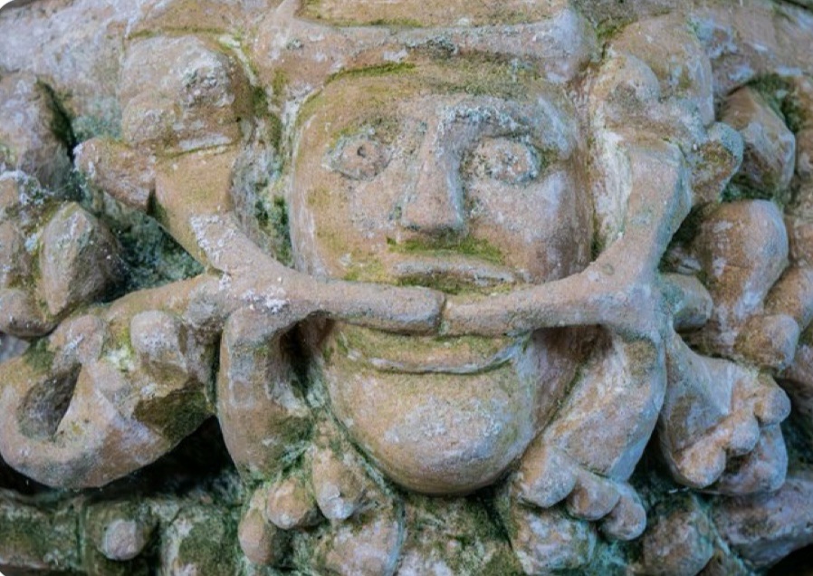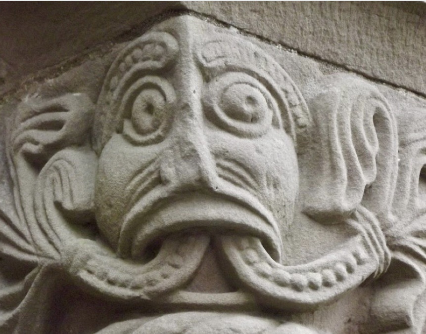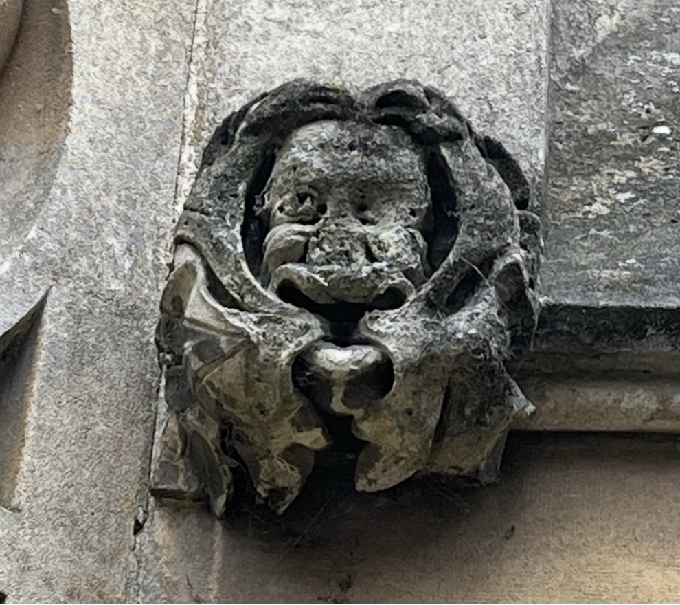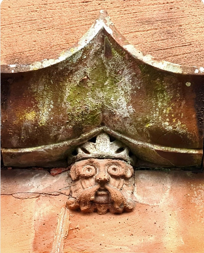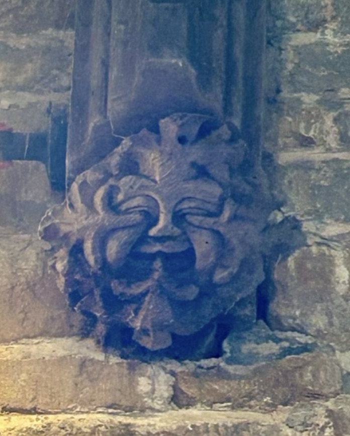 This is an oddity from the crypt of St John in the Wall, Bristol now in care of the CCT. It is a lions head holding a shield with its teeth and vegetation sprouting from its eyes.