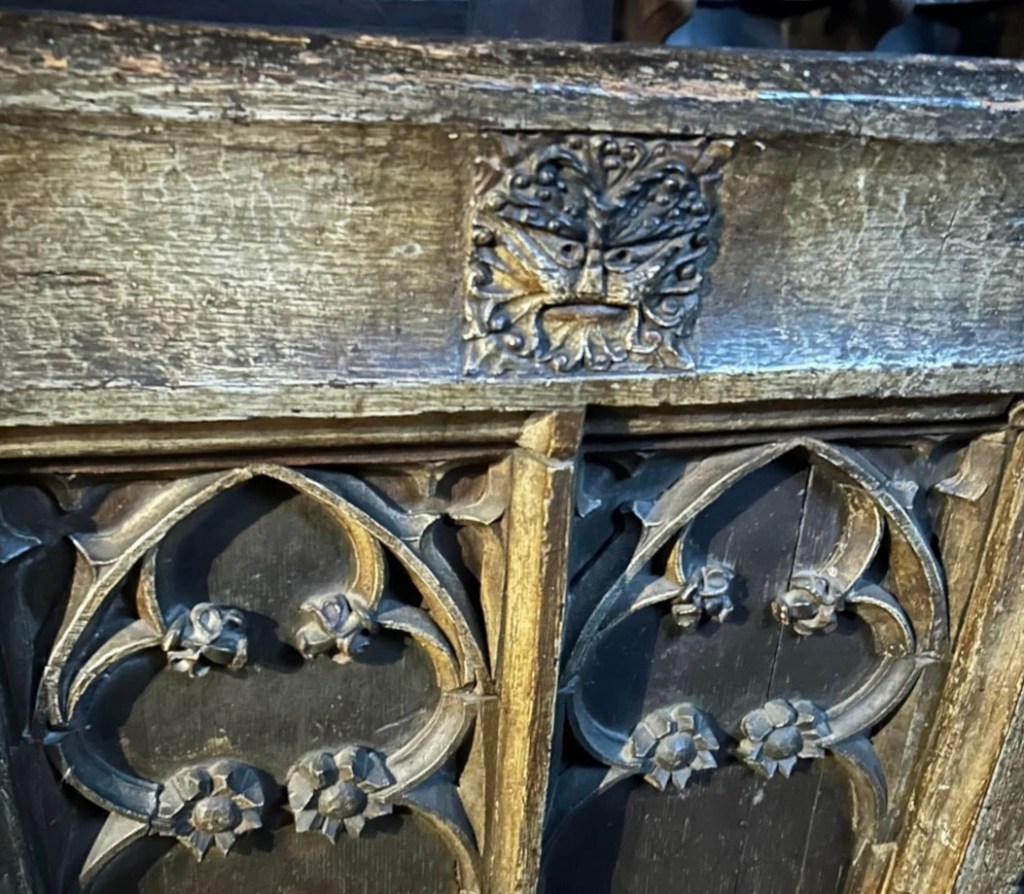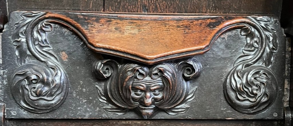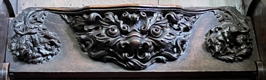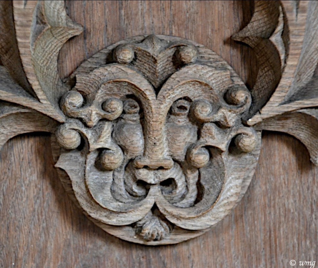 A very curious example that barely qualifies as GreenMan. Bench end from Clay-next-the-Sea courtesy @SimoninSuffolk