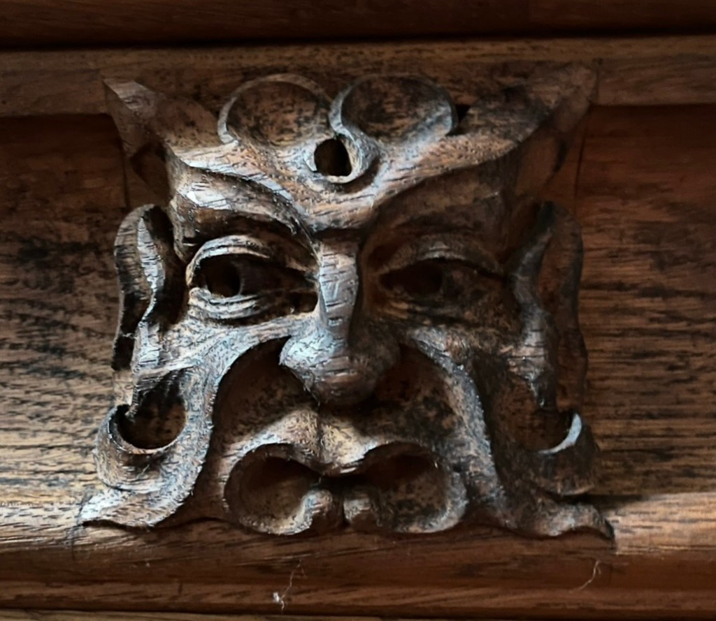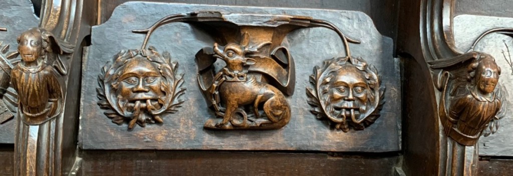 Pair of Green Men flanking a white hart, symbol of Richard 11 on Ludlow misericord. Own image.