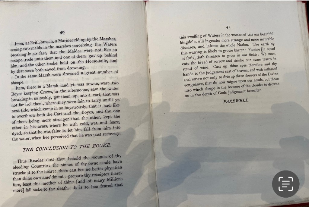 Also, prints of the South Wales flood were available in London but there is no information on the date of this 19th century reprint suggesting it was not contemporary but added later. Baker actually states the second flood was a year later almost to the day which makes it 1608 in modern dating. There must be records of it on mainland Europe. Can anyone find it in your records?